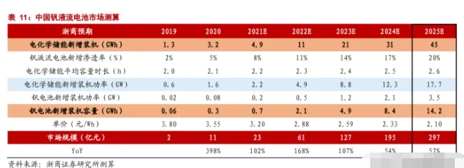 2025 年中國釩液流電池儲能新增 14.2GWh,裝機功率 3.5GW,滲透率 20%,對應市場規(guī)模 297 億元。 預計 2021-2025 年中國新增釩電池儲能 0.7/ 2.1/ 4.9/ 8.4/ 14.2 GWh,CAGR=113%。 預計釩電池規(guī)模應用后,單價平均每年降低 10%, 2021-2025 年單價為 3.2/2.9/2.6/2.3/2.1 元/Wh, 市場規(guī)模 23/ 61/ 127 /195 /297 億元,CAGR=92%。